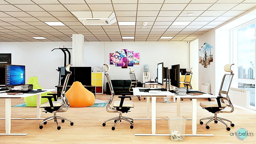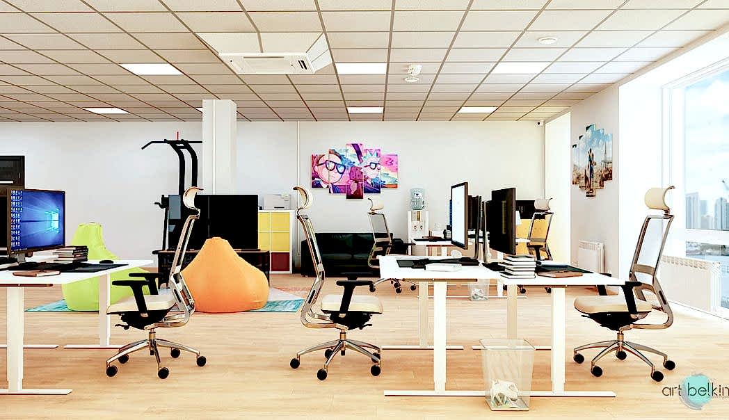 Задача: зонировать место для руководителя, рабочие места, место для отдыха. В интерьере преимущественно светлые и белые тона с яркими цветными акцентами.